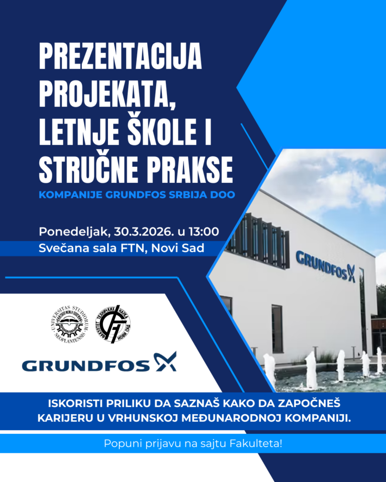 U ponedeljak, 30. marta 2026. godine u 13:00 časova, u Svečanoj sali Fakulteta tehničkih nauka u Novom Sadu, biće održana prezentacija kompanije <eng>Grundfos Srbija doo</eng> iz Inđije.